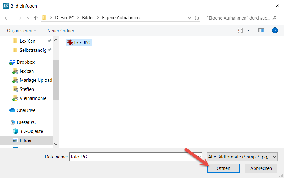 Navigate to the location of the image file using the file selection dialog box. Select it and confirm with "Open" ("Öffnen".