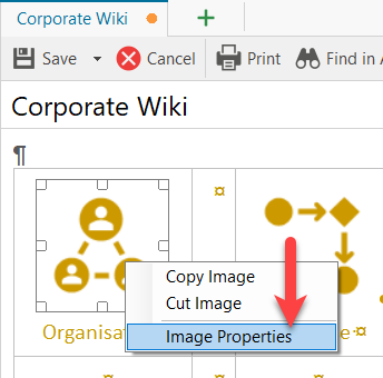 Images in articles can have different properties. To view and change them, edit the article, place the cursor over the image, open the context menu with the right mouse button and select "Image properties". As the following figure shows, you can also copy or cut an image in this way.