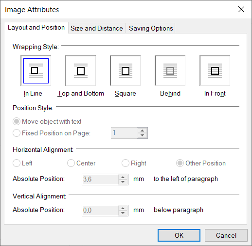 Using the "Image Attributes" dialog box, you can now make various settings for the image such as "Layout and Position" and "Size and Distance". The area "Saving options" is not relevant for lexiCan. If you want to export your project or parts of it into a HTML format, images must be defined as characters ("Wrapping Style") so that they keep their correct position in the HTML format. This also and especially applies when using the Web Interface +WEB.