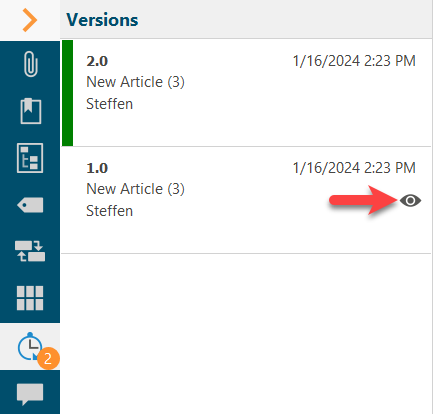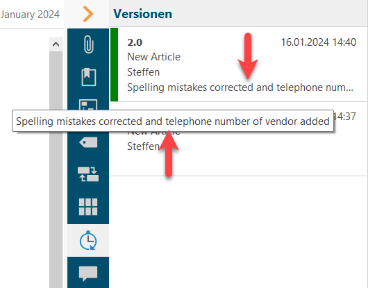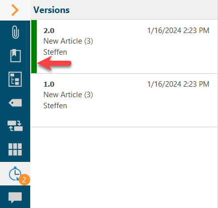 Previous versions of an article are listed in the context pane under "Versions" and labeled with version numbers. After versioning is activated, version 1.0 is only used for new articles, otherwise lexiCan starts with the number 2.0. The current version has the highest number and is highlighted in green, e.g.
