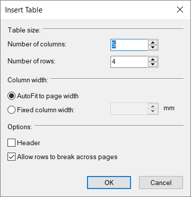 In the following dialogue window, determine the form and properties of the table, such as the number of columns and rows. If the option "Header" is selected, the top line is repeated on the next page in case of a page break.