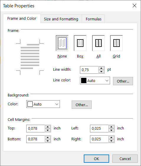 A dialogue window opens in which you can determine the "Frame and background" and "Size and formatting" of the table/ table area.