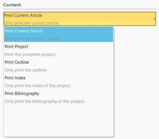 To the right of this, you are offered the usual setting options, e.g. printer selection/properties. Via "Content" and its pull-down menu you can select what exactly you like to print out, e.g. the current article.