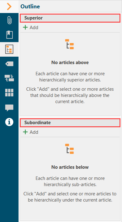 In the context pane of an article, a sub-area "Outline" is available. This is in turn subdivided into "Superior" and "Subordinate".