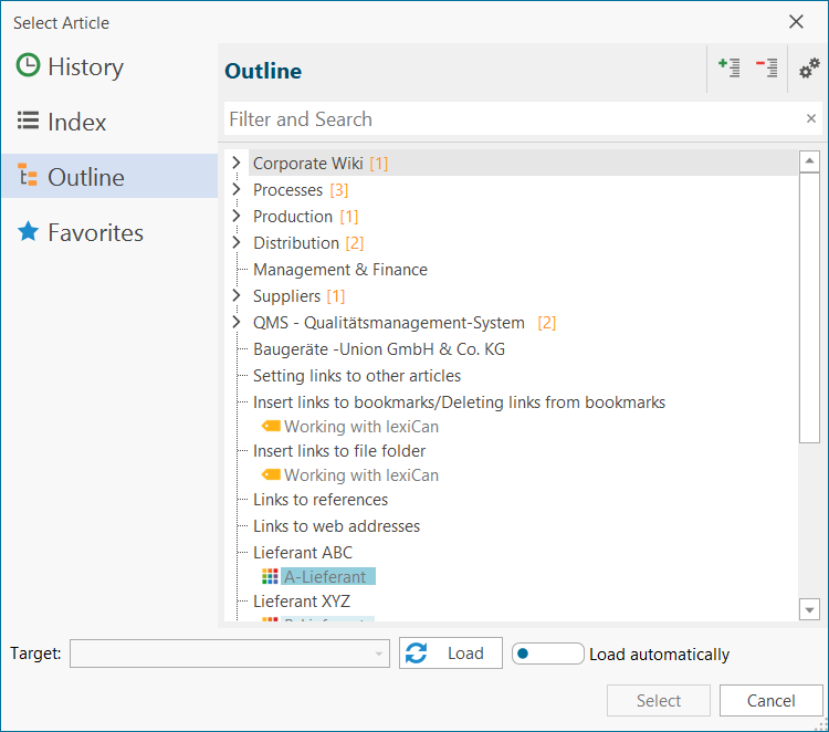To subordinate an article to another article, call up the article and click on "Add" in the "Parent" area. lexiCan then opens a dialogue box. Use the different views "History", "Index", "Outline" and "Favorites" to select the article that is to be superordinate to the currently opened article. Multiple selection is possible by holding down the control key.