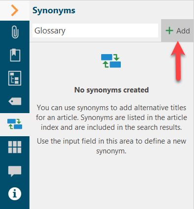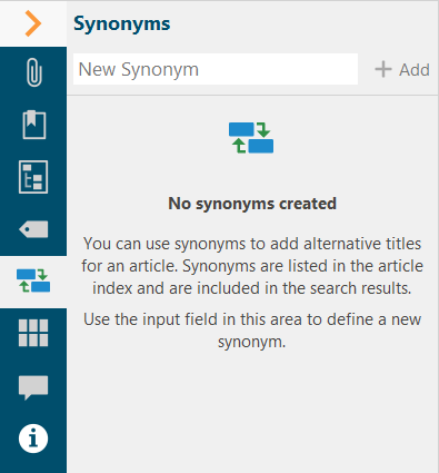 Articles have a title, i.e. a designation under which they are listed in the index and outline. lexiCan offers the possibility of defining additional synonyms, i.e. alternative designations for articles, via the context pane. These are then also listed in the index (not in the outline) for the article. The full-text search also takes synonymous article names into account.