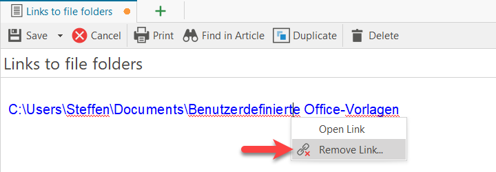 Editing or changing links on file folders is not possible. To delete, take the article in editing and select "Remove link" from the context menu (right mouse button).