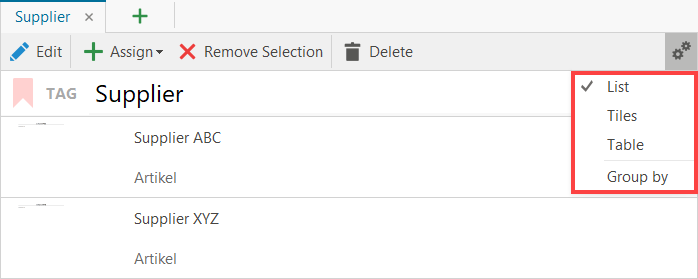 The view of the contents can be changed via the "gearwheel" button at the top right.