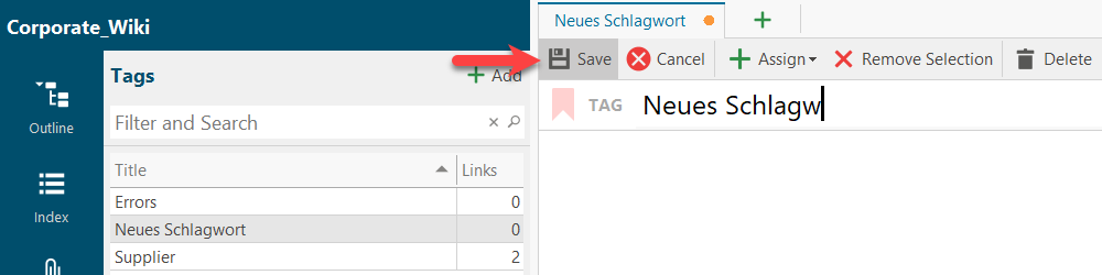 lexiCan then creates a new entry "New tag" in the list and opens a tab to overwrite this term and to save your entries.