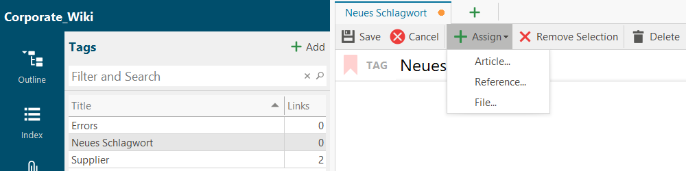 lexiCan allows you to define tags and assign them to articles, files and references. Tags can be used to subsume articles, references and files under specific terms and can also be found via these using a full-text search. However, they are not a prerequisite for finding content in articles or files; they are a supplementary structuring. In this context, also read the article Categorize Articles / Assign Features to Articles , in any case, the article on full-text search.