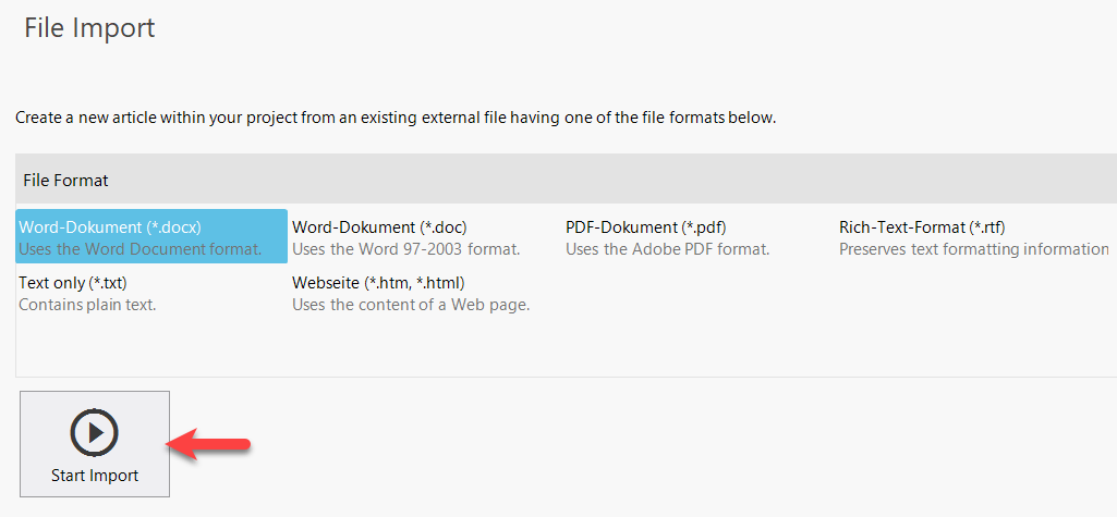 In the right part of the program window, you will then be presented with a choice of file formats that lexiCan can read out and convert into an article. Select the desired format and click on "Start import".