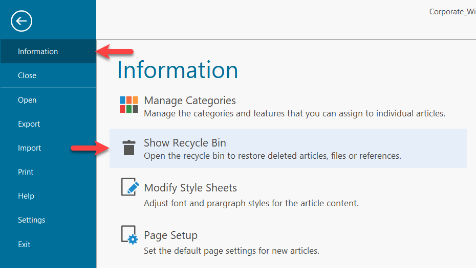 To open and view the recycle bin, click on "Show Recycle Bin" in the File/Information section of the main menu.