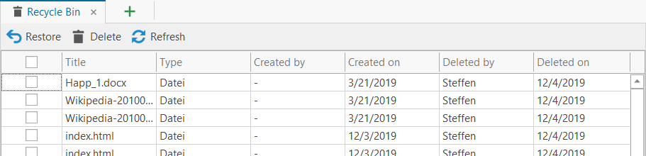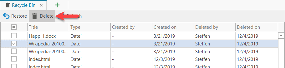 To restore contents from the recycle bin, select the relevant entry(s) and click on "Restore", e.g.