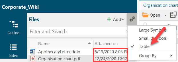 You can change the view of the list by clicking on the gearwheel icon. If you select "Table", additional columns, such as the insertion date of a file, are displayed, e.g.