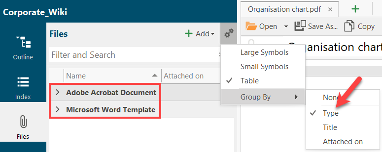 Using the same icon, you can group the files in different ways, e.g. by "Type".