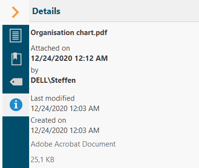 In the context area on the right hand side, you can view and change existing assignments of the file to articles, references and tags. Under "Details" you will find the metadata of the file, e.g.