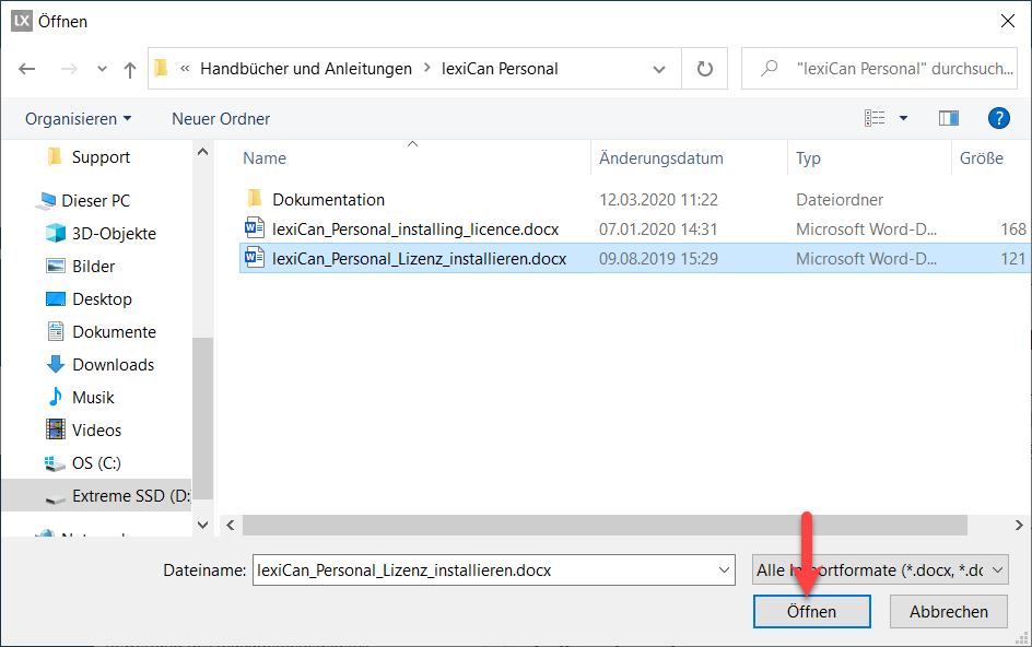 Via the file selection dialogue window, select the desired file and confirm this by clicking on "Open" ("Öffnen"), e.g.