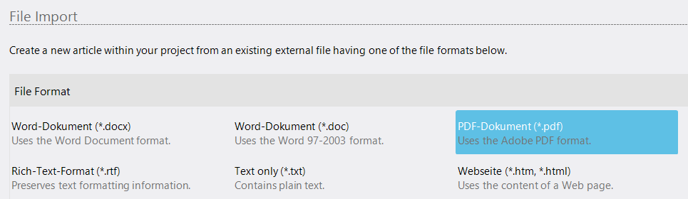 The import of PDF files, i.e. the transfer of content from PDF files into an article (text format) is technically a challenge, and due to the many different starting situations not every import succeeds in the desired way.