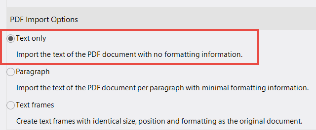 If you select "Text only" under "PDF Import Options" lexiCan extracts and transfers all text components it finds, adds missing spaces and line breaks and sorts text blocks so that they appear in their logical order. The resulting text then consists of individual text lines with a line break at the end of each line.